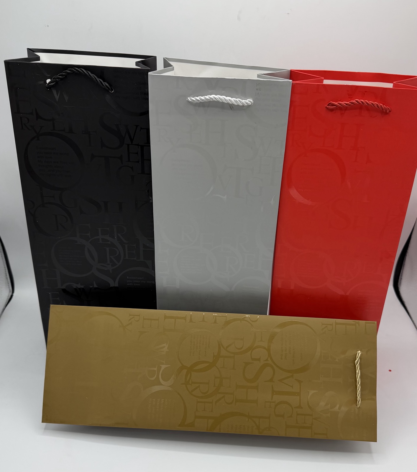 Елегантна подаръчна торбичка за бутилка с кутия . Пакета съдържа 4 цвята по три броя